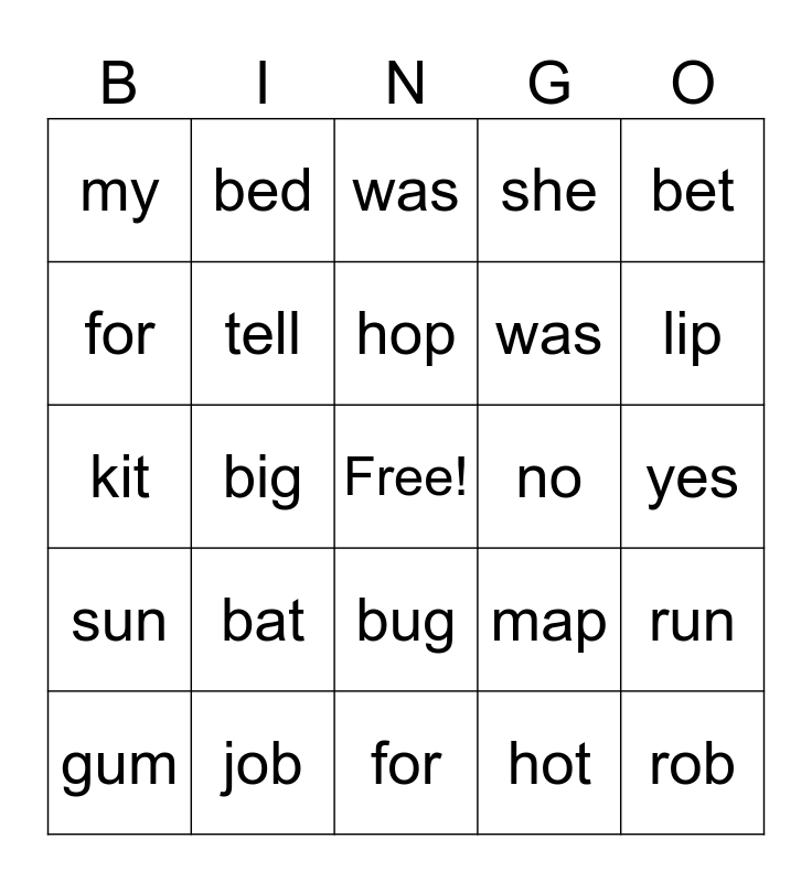 This bingo card has a free space and 24 words: bat, job, hop, gum, bet, my, for, bed, no, bug, was, kit, map, run, tell, hot, yes, was, lip, big, rob, sun, she and for.