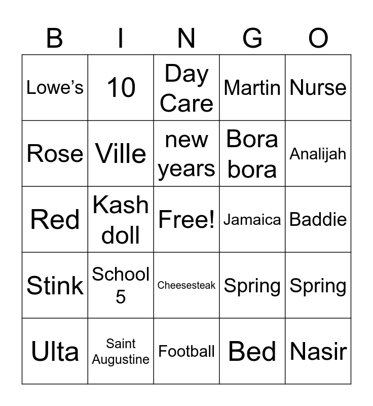 This bingo card has a free space and 29 words: Ulta, True Blood, Kash doll, Fendii, Lowe’s, Day Care, Ville, School 5, Jamaica, Saint Augustine, Baddie, Nasir, Football, Bed, Analijah, Micheal B Jordan, Cheesesteak, Stink, Nurse, Red, Spring, Ice cream, Bora bora, Rose, Martin, 10, Spring, new years and Pedi.