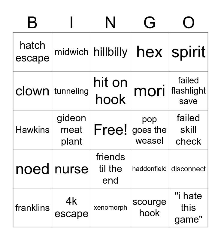 This bingo card has a free space and 24 words: nurse, 4k escape, hit on hook, franklins, spirit, hatch escape, clown, midwich, pop goes the weasel, friends til the end, mori, Hawkins, haddonfield, disconnect, tunneling, scourge hook, failed skill check, hillbilly, failed flashlight save, gideon meat plant, "i hate this game", noed, hex and xenomorph.