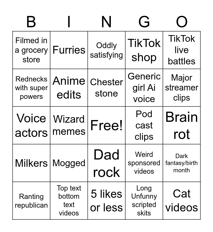This bingo card has a free space and 51 words: TikTok bingo, Cat videos, Mongolians, 5 likes or less, Mogged, Quiz’s, Furries, Red necks, Rednecks with super powers, Animals throwing it back, Anime edits, TikTok shop, Dark fantasy/birth month, Weird sponsored videos, Ai video game adds, Ai Reddit story videos, Chester stone, Pod cast clips, Monkey videos, TikTok live battles, Wizard memes, Long Unfunny scripted skits, Filmed in a grocery store, Generic girl Ai voice, Sad animal, “Send this to someone”, Major streamer clips, Ranting liberal, Ranting republican, Oddly satisfying, Yall’ternative girl, Muscle mommy, Extremely deep fried, ADHD side by side videos, 0.5 memes, Top text bottom text videos, Uncanny valley, Ai generated videos, Sample this, Wallpapers, Brain rot, Milkers, Cooking, Barber videos, Asmr slime, Farm animals, Voice actors, Dancing but funny, SpongeBob, Dad rock and Stay out of Gothamn.