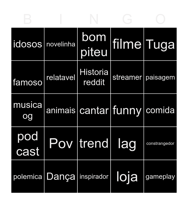 This bingo card has a free space and 24 words: Pov, Dança, Historia reddit, polemica, Tuga, idosos, famoso, novelinha, funny, trend, streamer, musica og, lag, constrangedor, relatavel, loja, comida, bom piteu, paisagem, animais, gameplay, pod cast, filme and inspirador.