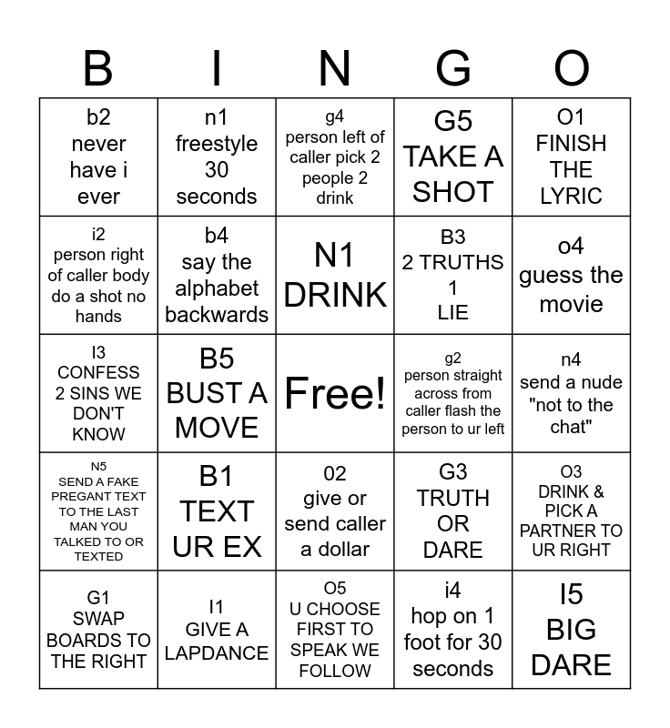 This bingo card has a free space and 24 words: B1 TEXT UR EX, I1 GIVE A LAPDANCE, N1 DRINK, G1 SWAP BOARDS TO THE RIGHT, O1 FINISH THE LYRIC, b2 never have i ever, i2 person right of caller body do a shot no hands, n1 freestyle 30 seconds, g2 person straight across from caller flash the person to ur left, 02 give or send caller a dollar, B3 2 TRUTHS 1 LIE, I3 CONFESS 2 SINS WE DON'T KNOW, G3 TRUTH OR DARE, O3 DRINK & PICK A PARTNER TO UR RIGHT, b4 say the alphabet backwards, i4 hop on 1 foot for 30 seconds, n4 send a nude "not to the chat", g4 person left of caller pick 2 people 2 drink, o4 guess the movie, B5 BUST A MOVE, I5 BIG DARE, N5 SEND A FAKE PREGANT TEXT TO THE LAST MAN YOU TALKED TO OR TEXTED, G5 TAKE A SHOT and O5 U CHOOSE FIRST TO SPEAK WE FOLLOW.