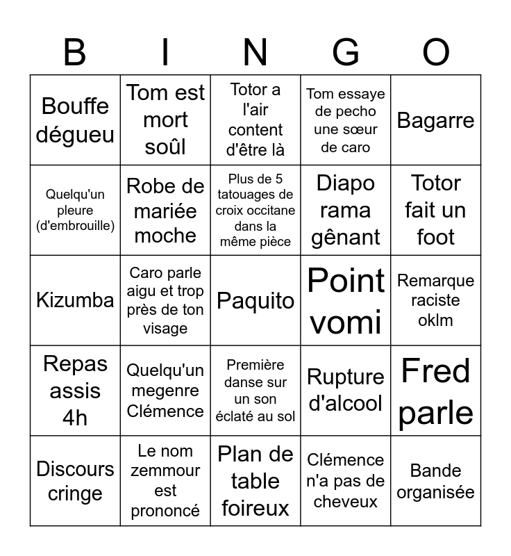 This bingo card has a free space and 24 words: Quelqu'un megenre Clémence, Le nom zemmour est prononcé, Plus de 5 tatouages de croix occitane dans la même pièce, Discours cringe, Bagarre, Bouffe dégueu, Quelqu'un pleure (d'embrouille), Tom est mort soûl, Point vomi, Première danse sur un son éclaté au sol, Diapo rama gênant, Kizumba, Rupture d'alcool, Fred parle, Robe de mariée moche, Clémence n'a pas de cheveux, Remarque raciste oklm, Totor a l'air content d'être là, Totor fait un foot, Caro parle aigu et trop près de ton visage, Bande organisée, Repas assis 4h, Tom essaye de pecho une sœur de caro and Plan de table foireux.