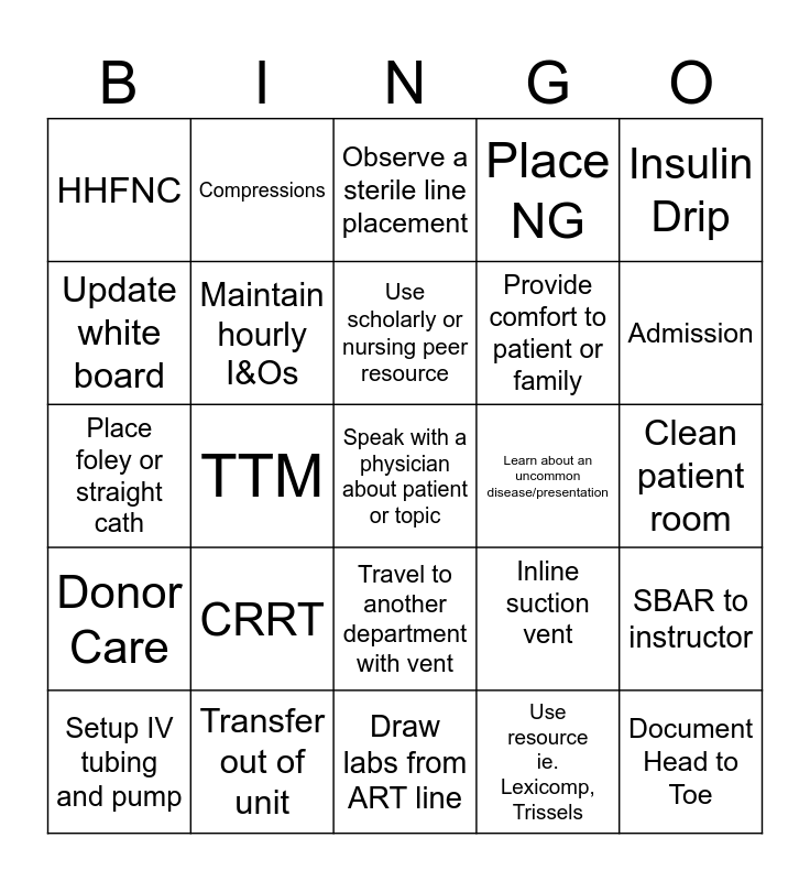This bingo card has a free space and 44 words: Trach Care, Document Head to Toe, Observe intubation, Setup IV tubing and pump, Full bed bath vent patient, Use resource ie. Lexicomp, Trissels, Observe a sterile line placement, Administer all medications for shift, Insulin Drip, Transfer out of unit, Place NG, Learn about an uncommon disease/presentation, Travel to another department with vent, CRRT, Post mortem care, Draw labs from ART line, WOLST, Place foley or straight cath, Wound Care, Admission, Compressions, Administer IVPB, Care for a trauma patient, HHFNC, Provide patient education, Clean patient room, Ambulate patient, Administer medications via NG/OG/PEG, Inline suction vent, Donor Care, Float to specialty unit, SBAR to instructor, Offer suggestion that is utilized, Beir Hugger, TTM, Blanketrol, Bladder scanner, Continuous EEG monitoring, Use scholarly or nursing peer resource, Update white board, Provide comfort to patient or family, Recognize arrhythmia and identify treatment, Maintain hourly I&Os and Heparin Drip.