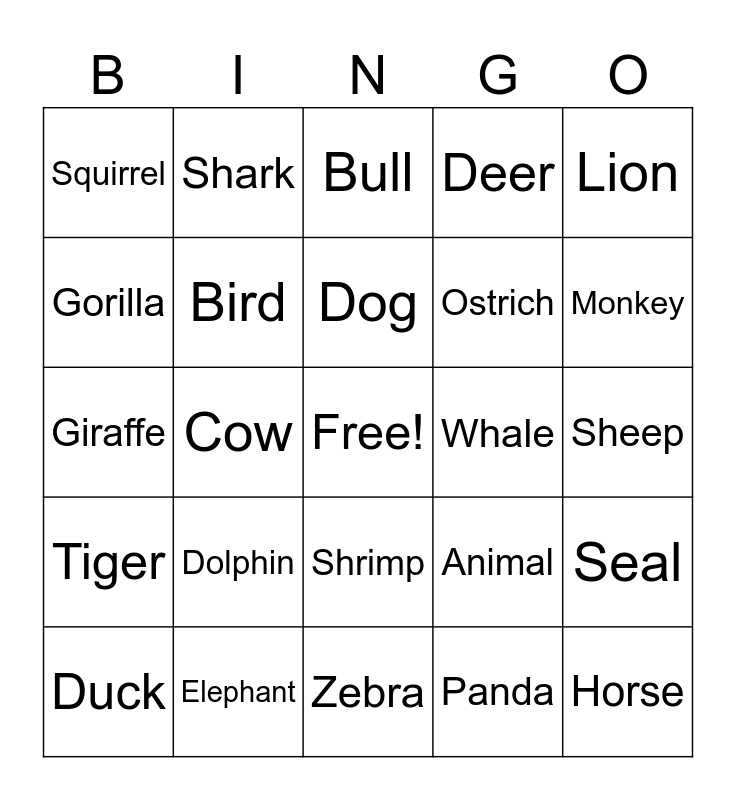 This bingo card has a free space and 29 words: Duck, Pig, Cow, Rabbit, Squirrel, Bull, Bird, Dolphin, Whale, Elephant, Sheep, Horse, Zebra, Panda, Monkey, Walrus, Shrimp, Tiger, Lion, Giraffe, Animal, Rooster, Ostrich, Gorilla, Deer, Shark, Seal, Dog and Rhino.