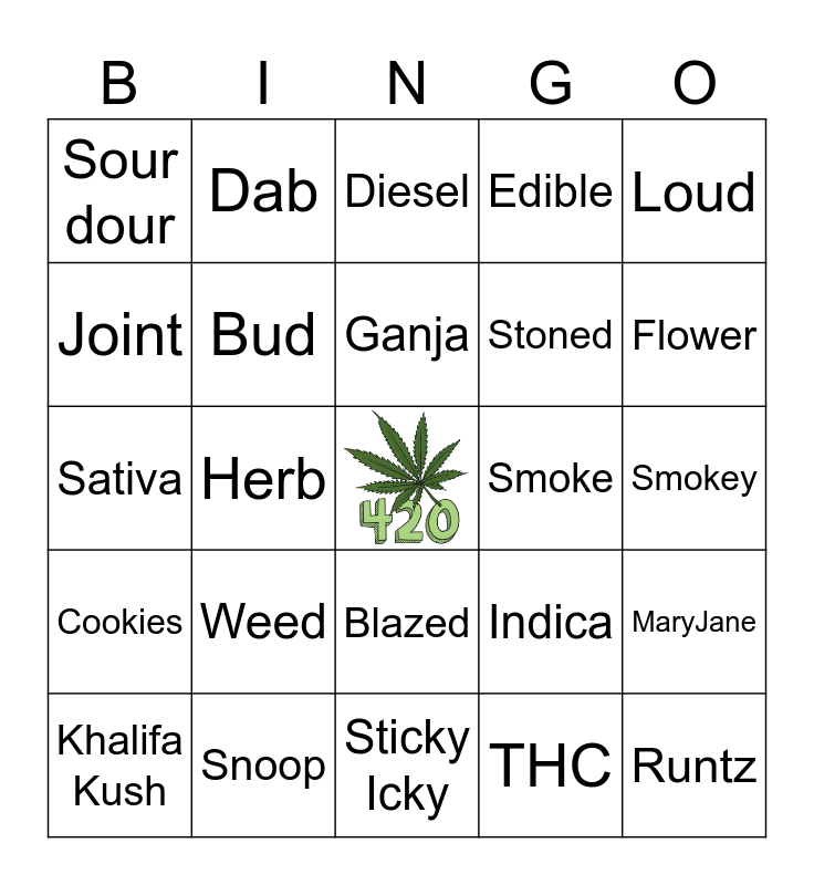 This bingo card has a free space and 24 words: Weed, Snoop, Ganja, Khalifa Kush, Loud, Sour dour, Joint, Dab, Smoke, Blazed, Stoned, Sativa, Indica, MaryJane, Bud, THC, Smokey, Diesel, Flower, Herb, Runtz, Cookies, Edible and Sticky Icky.