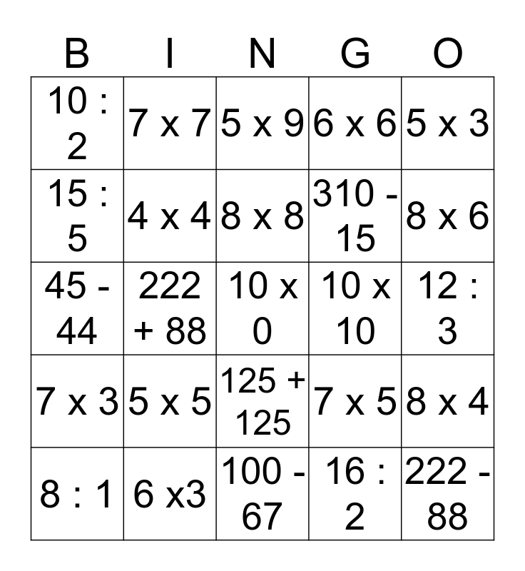 This bingo card has a free space and 24 words: 5 x 5, 6 x3, 8 x 8, 8 : 1, 5 x 3, 10 : 2, 15 : 5, 7 x 7, 10 x 10, 125 + 125, 310 - 15, 45 - 44, 7 x 5, 8 x 4, 4 x 4, 16 : 2, 12 : 3, 5 x 9, 8 x 6, 222 + 88, 222 - 88, 7 x 3, 6 x 6 and 100 - 67.