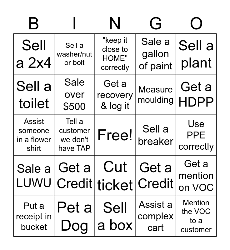 This bingo card has a free space and 24 words: Get a Credit, Pet a Dog, Get a recovery & log it, Put a receipt in bucket, Sell a plant, Sell a 2x4, Sell a toilet, Sell a washer/nut or bolt, Sell a breaker, Cut ticket, Measure moulding, Assist someone in a flower shirt, Get a Credit, Get a mention on VOC, Sale over $500, Assist a complex cart, Use PPE correctly, "keep it close to HOME" correctly, Get a HDPP, Tell a customer we don't have TAP, Mention the VOC to a customer, Sale a LUWU, Sale a gallon of paint and Sell a box.