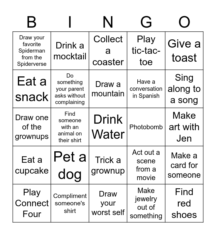 This bingo card has a free space and 24 words: Pet a dog, Compliment someone's shirt, Draw a mountain, Play Connect Four, Give a toast, Draw your favorite Spiderman from the Spiderverse, Eat a snack, Drink a mocktail, Photobomb, Trick a grownup, Have a conversation in Spanish, Draw one of the grownups, Act out a scene from a movie, Make a card for someone, Do something your parent asks without complaining, Make jewelry out of something, Make art with Jen, Collect a coaster, Sing along to a song, Find someone with an animal on their shirt, Find red shoes, Eat a cupcake, Play tic-tac-toe and Draw your worst self.