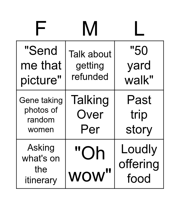 This bingo card has a free space and 12 words: "oh Gene", George, Loudly offering food, Past trip story, Talk about getting refunded, "50 yard walk", "Oh wow", Takes picture through window, "Send me that picture", Gene taking photos of random women, Asking what's on the itinerary and Correcting per.