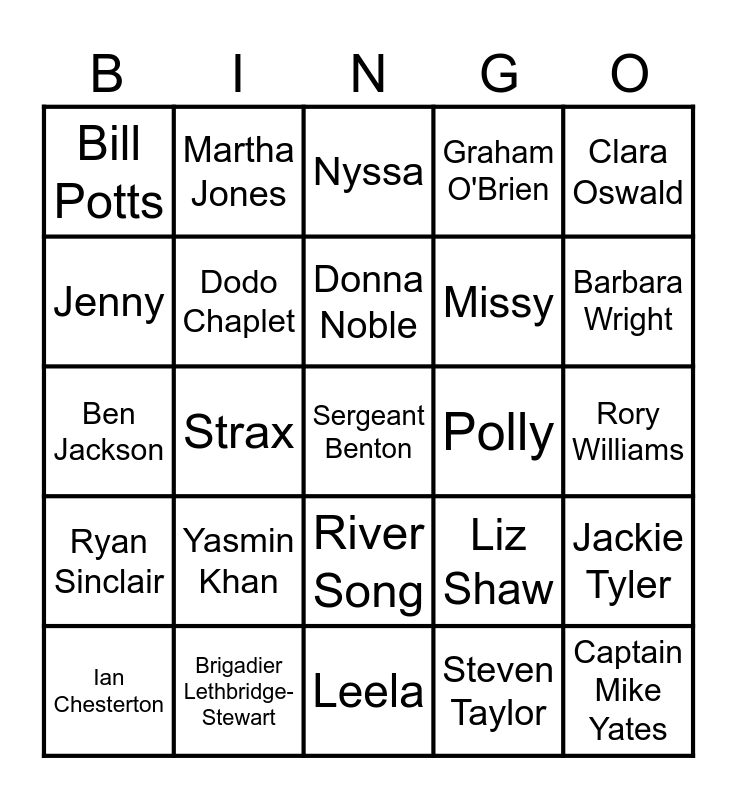 This bingo card has 64 words: Free!, Rose Tyler, Mickey Smith, Jackie Tyler, Captain Jack Harkness, Sarah Jane Smith, Martha Jones, Sally Sparrow, Donna Noble, Wilfred Mott, River Song, Amy Pond, Rory Williams, Clara Oswald, Madame Vastra, Jenny, Strax, Bill Potts, Nardole, Missy, Yasmin Khan, Ryan Sinclair, Graham O'Brien, Dan Lewis, Karvanista, Bel & Vister, Kate Stewart, Osgood, Shirley Bingham, Shaun Temple, Rose Noble, Sylvia Noble, Ruby Sunday, Susan Foreman, Barbara Wright, Ian Chesterton, Vicki, Steven Taylor, Katarina, Dodo Chaplet, Ben Jackson, Polly, Jamie McCrimmon, Victoria Waterfield, Zoe Herriot, Sergeant Benton, Brigadier Lethbridge-Stewart, Captain Mike Yates, Liz Shaw, Jo Grant, K-9, Harry Sullivan, Leela, Romana I, Romana II, Adric, Nyssa, Tegan Jovanka, Vislor Turlough, Kamelion, Peri Brown, Mel Bush, Ace and Grace Holloway.