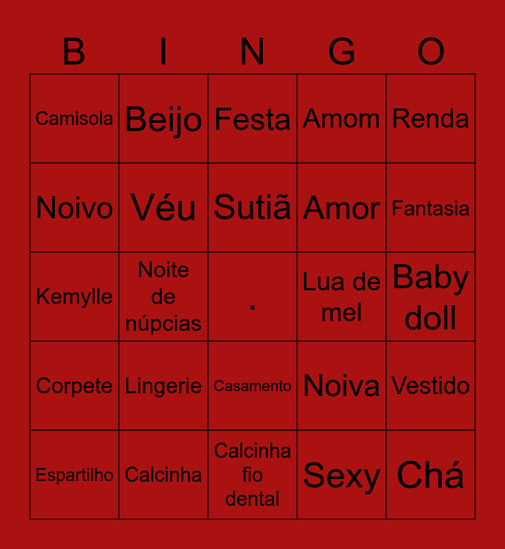 This bingo card has a free space and 24 words: Lingerie, Calcinha, Sutiã, Espartilho, Renda, Camisola, Noivo, Beijo, Lua de mel, Casamento, Amor, Kemylle, Noiva, Vestido, Véu, Sexy, Baby doll, Festa, Fantasia, Noite de núpcias, Chá, Corpete, Amom and Calcinha fio dental.