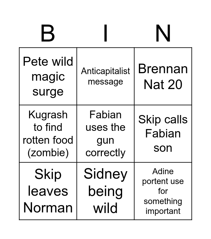 This bingo card has a free space and 8 words: Skip calls Fabian son, Brennan Nat 20, Anticapitalist message, Skip leaves Norman, Pete wild magic surge, Adine portent use for something important, Kugrash to find rotten food (zombie) and Sidney being wild.
