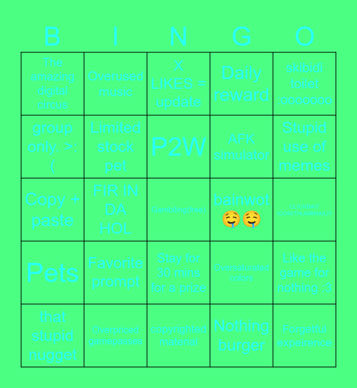 This bingo card has a free space and 24 words: Favorite prompt, Overpriced gamepasses, P2W, that stupid nugget, skibidi toilet :ooooooo, The amazing digital circus, group only. >:(, Overused music, bainwot 🤤🤤, Stay for 30 mins for a prize, AFK simulator, Copy + paste, Oversaturated colors, Like the game for nothing :3, Limited stock pet, Nothing burger, CLICKBAIT ICON/THUMBNAIL!!!, X LIKES = update, Stupid use of memes, FIR IN DA HOL, Forgetful expeirence, Pets, Daily reward and copyrighted material.