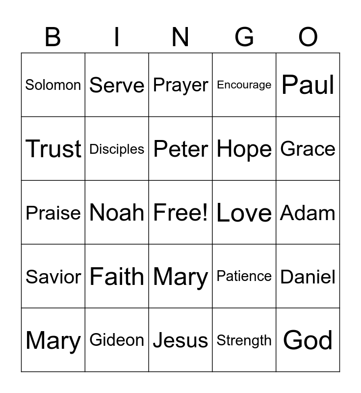 This bingo card has a free space and 29 words: Mary, Forgiveness, Noah, Brave, Solomon, Prayer, Disciples, Faith, Love, Gideon, Adam, God, Jesus, Strength, Grace, Joseph, Mary, Savior, Paul, Praise, Patience, Obey, Hope, Trust, Encourage, Serve, Daniel, Peter and Moses.