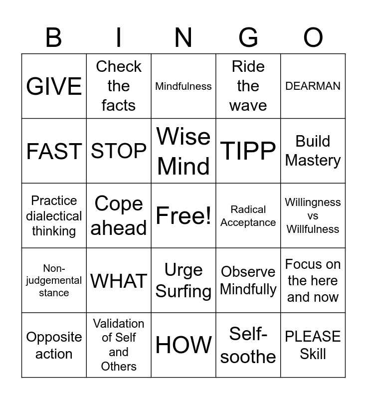 This bingo card has a free space and 25 words: WHAT, HOW, Wise Mind, Opposite action, DEARMAN, GIVE, FAST, Check the facts, Radical Acceptance, Urge Surfing, TIPP, Practice dialectical thinking, Observe Mindfully, Focus on the here and now, STOP, ACCEPTS, Willingness vs Willfulness, Mindfulness, Build Mastery, Cope ahead, PLEASE Skill, Validation of Self and Others, Non-judgemental stance, Ride the wave and Self-soothe.