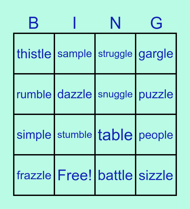 This bingo card has 25 words: tremble, title, puzzle, hobble, rumble, thistle, dazzle, sample, Free!, topple, simple, table, steeple, puddle, snuggle, cuddle, battle, struggle, stumble, people, frazzle, truffle, sizzle, gargle and kettle.