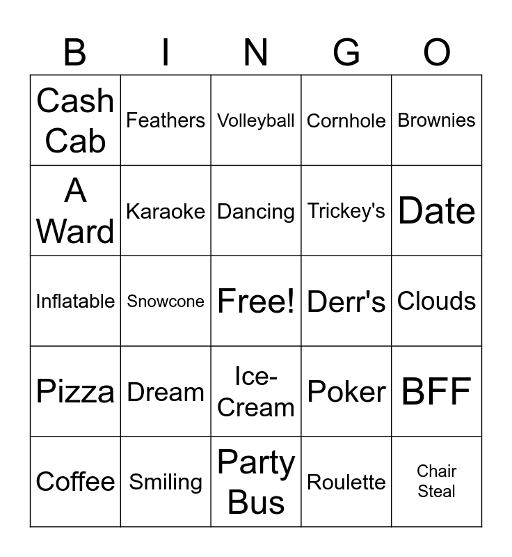 This bingo card has a free space and 24 words: Dream, Smiling, Dancing, Coffee, Brownies, Cash Cab, A Ward, Feathers, Derr's, Ice-Cream, Trickey's, Inflatable, Poker, BFF, Karaoke, Roulette, Clouds, Volleyball, Date, Snowcone, Chair Steal, Pizza, Cornhole and Party Bus.