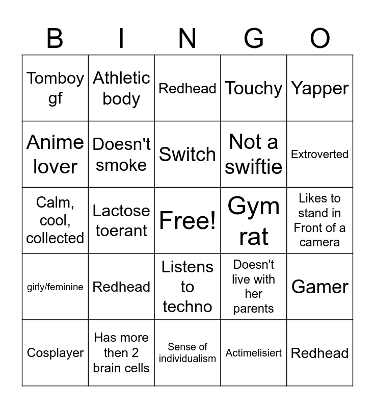 This bingo card has a free space and 24 words: Redhead, Has more then 2 brain cells, Switch, Cosplayer, Yapper, Tomboy gf, Anime lover, Athletic body, Gym rat, Listens to techno, Not a swiftie, Calm, cool, collected, Doesn't live with her parents, Gamer, Doesn't smoke, Actimelisiert, Likes to stand in Front of a camera, Redhead, Extroverted, Lactose toerant, Redhead, girly/feminine, Touchy and Sense of individualism.
