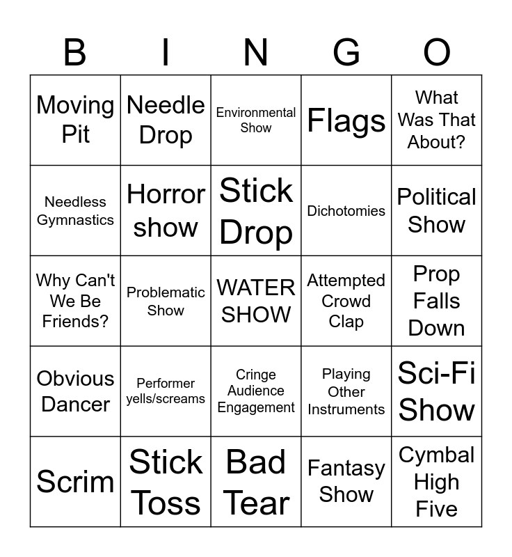 This bingo card has a free space and 24 words: Performer yells/screams, Stick Toss, Stick Drop, Scrim, What Was That About?, Moving Pit, Needless Gymnastics, Needle Drop, Attempted Crowd Clap, Cringe Audience Engagement, Dichotomies, Why Can't We Be Friends?, Playing Other Instruments, Sci-Fi Show, Horror show, Fantasy Show, Prop Falls Down, Environmental Show, Political Show, Problematic Show, Cymbal High Five, Obvious Dancer, Flags and Bad Tear.