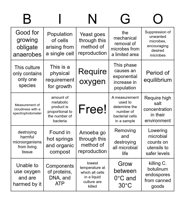 This bingo card has a free space and 24 words: Found in hot springs and organic compost, Components of proteins, DNA, and ATP, Require oxygen, Unable to use oxygen and are harmed by it, Suppression of unwanted microbes, encouraging desired microbes, Good for growing obligate anaerobes, This culture only contains only one species, Population of cells arising from a single cell, A measurement used to determine the number of bacterial cells in a sample, Amoeba go through this method of reproduction, This phase causes an exponential increase in population, Measurement of cloudiness with a spectrophotometer, Removing and destroying all microbial life, Lowering microbial counts on utensils to safer levels, This is a physical requirement for growth, Grow between 0°C and 30°C, Require high salt concentration in their environment, Yeast goes through this method of reproduction, Period of equilibrium, amount of metabolic product is proportional to the number of bacteria, killing C. botulinum endospores from canned goods, destroying harmful microorganisms from living tissue, the mechanical removal of microbes from a limited area and lowest temperature at which all cells in a liquid culture are killed.
