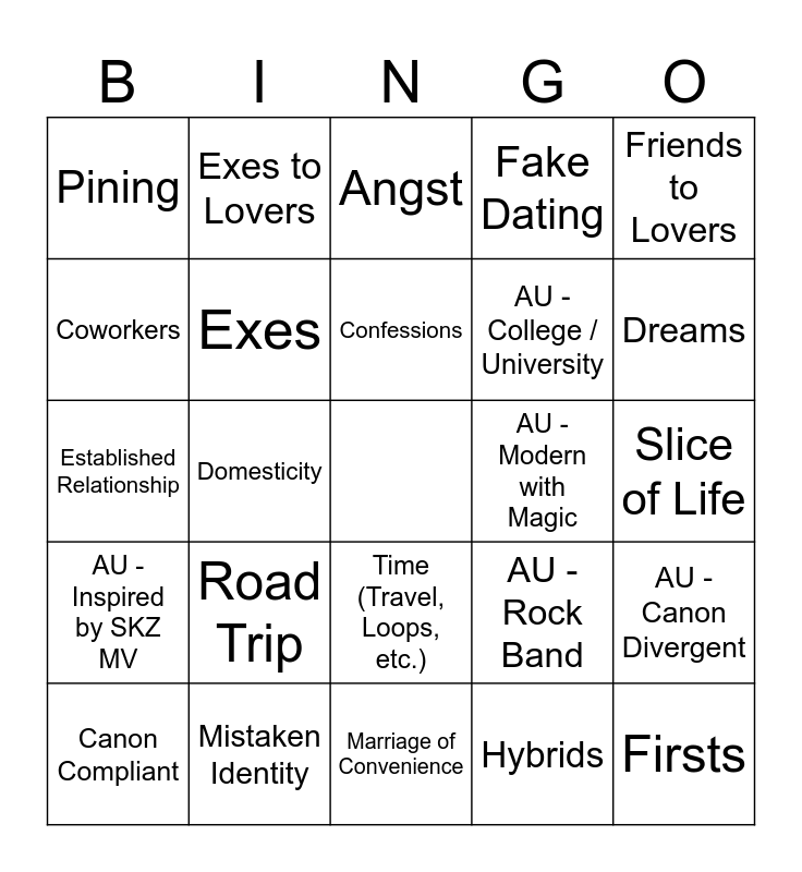 This bingo card has a free space and 74 words: 3+1 / 5+1 Times, A/B/O Elements, Angst, Angst and Fluff, Animals / Pets, Arranged Marriage, Based on Other Media, Blind Date, Canon Compliant, Celestial Beings, Childhood Friends, Childhood Sweethearts, Confessions, Coworkers, Dares, Domesticity, Didn’t Know They Were Dating, Dreams, Enemies / Rivals to Lovers, Established Relationship, Exes, Exes to Lovers, Fake Dating, Feelings Realization, Firsts, Fluff, Food / Cooking, Forbidden Love, Found Family, Friends With Benefits, Friends to Lovers, Ghosts / Paranormal, Handholding, Happy Ending, Hurt/Comfort, Hybrids, Idiots in Love, Kidfic, Magic, Marriage / Married Life / Weddings, Marriage of Convenience, Mistaken Identity, Mutual Pining, Neighbors, One Night Stands, Pining, Rivals with Benefits, Road Trip, Roommates, Secret Admirer, Sharing a Bed, Sickfic, Slice of Life, Slow Burn, Soulmates, Strangers to Lovers, Time (Travel, Loops, etc.), Trapped Together, AU - Bodyguard, AU - Canon Divergent, AU - College / University, AU - Fantasy, AU - Inspired by SKZ MV, AU - Modern, AU - Modern with Magic, AU - Non-Idol Celebrity, AU - Office, AU - Reincarnation, AU - Rock Band, AU - Royalty, AU - Shops, AU - Small Town, AU - Vampires and AU - Werewolves.
