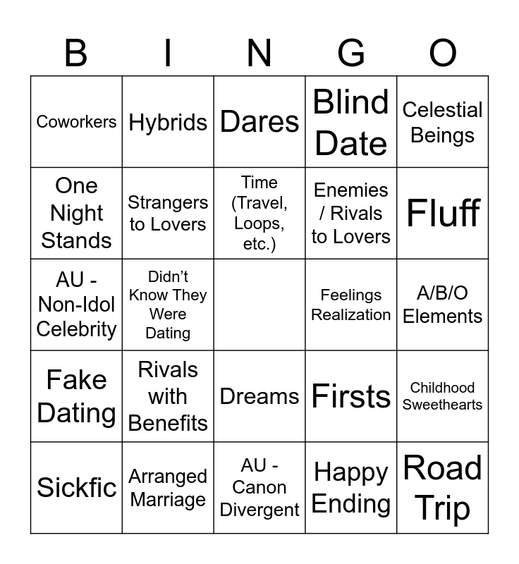 This bingo card has a free space and 69 words: 3+1 / 5+1 Times, A/B/O Elements, Angst and Fluff, Animals / Pets, Arranged Marriage, Based on Other Media, Blind Date, Canon Compliant, Celestial Beings, Childhood Friends, Childhood Sweethearts, Confessions, Coworkers, Dares, Domesticity, Didn’t Know They Were Dating, Dreams, Enemies / Rivals to Lovers, Established Relationship, Fake Dating, Feelings Realization, Firsts, Fluff, Food / Cooking, Found Family, Friends With Benefits, Friends to Lovers, Handholding, Happy Ending, Hurt/Comfort, Hybrids, Idiots in Love, Magic, Marriage / Married Life / Weddings, Marriage of Convenience, Mistaken Identity, Mutual Pining, Neighbors, One Night Stands, Pining, Rivals with Benefits, Road Trip, Roommates, Secret Admirer, Sharing a Bed, Sickfic, Slice of Life, Slow Burn, Soulmates, Strangers to Lovers, Time (Travel, Loops, etc.), Trapped Together, AU - Bodyguard, AU - Canon Divergent, AU - College / University, AU - Fantasy, AU - Inspired by SKZ MV, AU - Modern, AU - Modern with Magic, AU - Non-Idol Celebrity, AU - Office, AU - Reincarnation, AU - Royalty, AU - Shops, AU - Small Town, AU - Space, AU - Spies / Secret Agents, AU - Vampires and AU - Werewolves.