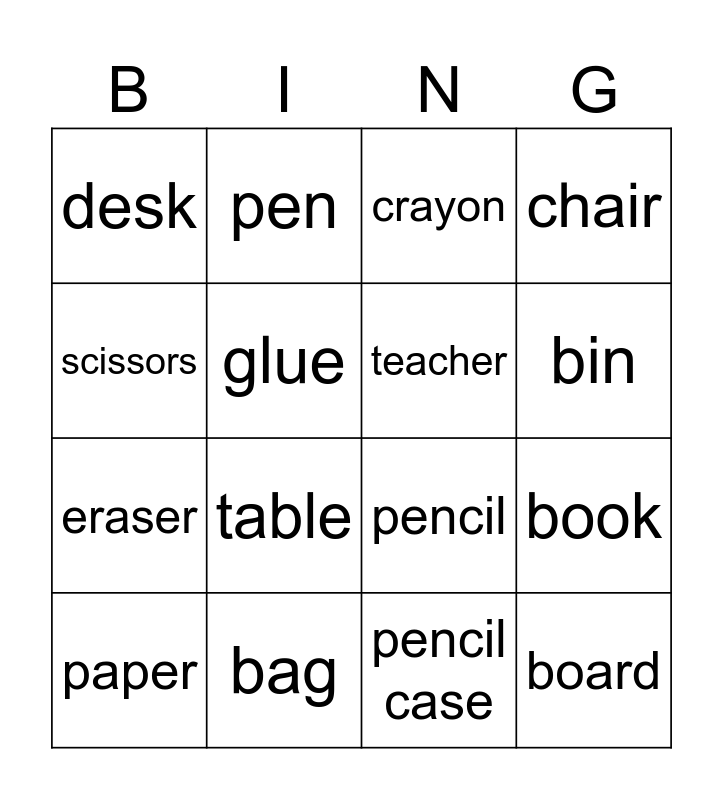 This bingo card has 16 words: bag, book, crayon, desk, eraser, pen, pencil, pencil case, scissors, glue, paper, chair, table, bin, teacher and board.