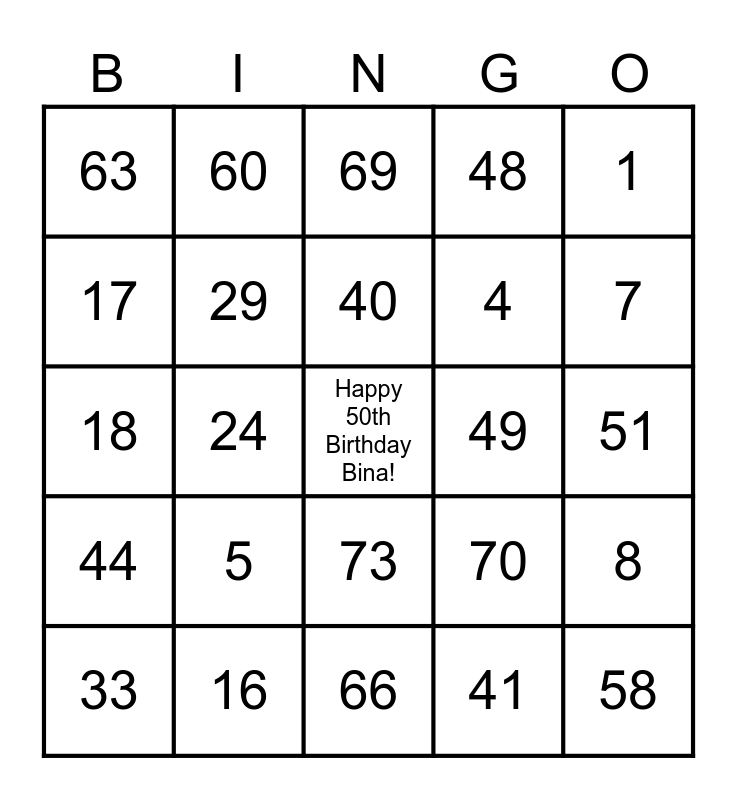 This bingo card has a free space and 24 words: 5, 16, 40, 33, 1, 63, 17, 60, 49, 73, 4, 18, 70, 8, 29, 41, 51, 69, 7, 24, 58, 44, 48 and 66.