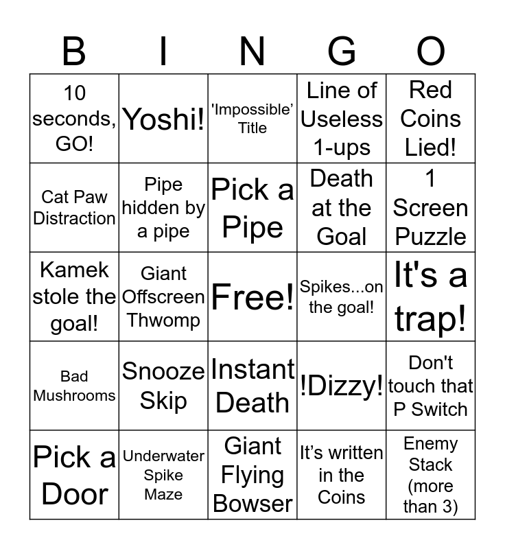 This bingo card has a free space and 25 words: Snooze Skip, Giant Flying Bowser, Pick a Pipe, Pick a Door, Red Coins Lied!, 10 seconds, GO!, Cat Paw Distraction, Yoshi!, Spikes...on the goal!, Instant Death, Death at the Goal, Kamek stole the goal!, !Dizzy!, Don't touch that P Switch, Pipe hidden by a pipe, 'Lanky’ Mario, It's a trap!, 'Impossible’ Title, 1 Screen Puzzle, Giant Offscreen Thwomp, Enemy Stack (more than 3), Underwater Spike Maze, Bad Mushrooms, Line of Useless 1-ups and It’s written in the Coins.