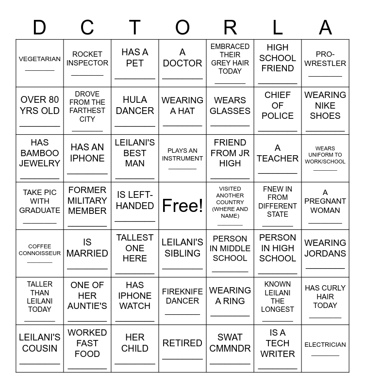This bingo card has a free space and 49 words: KNOWN LEILANI THE LONGEST ________, CHIEF OF POLICE ________, SWAT CMMNDR ________, FORMER MILITARY MEMBER ________, LEILANI'S BEST MAN ________, A PREGNANT WOMAN ________, ROCKET INSPECTOR ________, HER CHILD ________, HIGH SCHOOL FRIEND ________, LEILANI'S SIBLING ________, PRO-WRESTLER ________, A DOCTOR ________, A TEACHER ________, FRIEND FROM JR HIGH ________, ONE OF HER AUNTIE'S ________, FNEW IN FROM DIFFERENT STATE ________, OVER 80 YRS OLD ________, WEARING NIKE SHOES ________, HAS CURLY HAIR TODAY ________, EMBRACED THEIR GREY HAIR TODAY ________, WEARS GLASSES ________, IS LEFT-HANDED ________, VEGETARIAN ________, DROVE FROM THE FARTHEST CITY ________, LEILANI'S COUSIN ________, HULA DANCER ________, WEARS UNIFORM TO WORK/SCHOOL ________, WORKED FAST FOOD ________, PLAYS AN INSTRUMENT ________, HAS AN IPHONE ________, HAS AN ANDROID ________, VISITED ANOTHER COUNTRY (WHERE AND NAME) ________, TALLER THAN LEILANI TODAY ________, HAS IPHONE WATCH ________, TAKE PIC WITH GRADUATE ________, PERSON IN MIDDLE SCHOOL ________, PERSON IN HIGH SCHOOL ________, WEARING JORDANS ________, HAS BAMBOO JEWELRY ________, TALLEST ONE HERE ________, FIREKNIFE DANCER ________, COFFEE CONNOISSEUR ________, ELECTRICIAN ________, RETIRED ________, WEARING A HAT ________, HAS A PET ________, WEARING A RING ________, IS MARRIED ________ and IS A TECH WRITER ________.