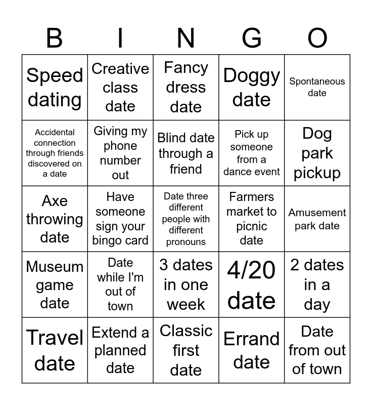 This bingo card has a free space and 24 words: Date while I'm out of town, Extend a planned date, Blind date through a friend, Travel date, Spontaneous date, Speed dating, Accidental connection through friends discovered on a date, Creative class date, Farmers market to picnic date, 3 dates in one week, Pick up someone from a dance event, Axe throwing date, 4/20 date, 2 dates in a day, Giving my phone number out, Errand date, Amusement park date, Fancy dress date, Dog park pickup, Have someone sign your bingo card, Date from out of town, Museum game date, Doggy date and Classic first date.