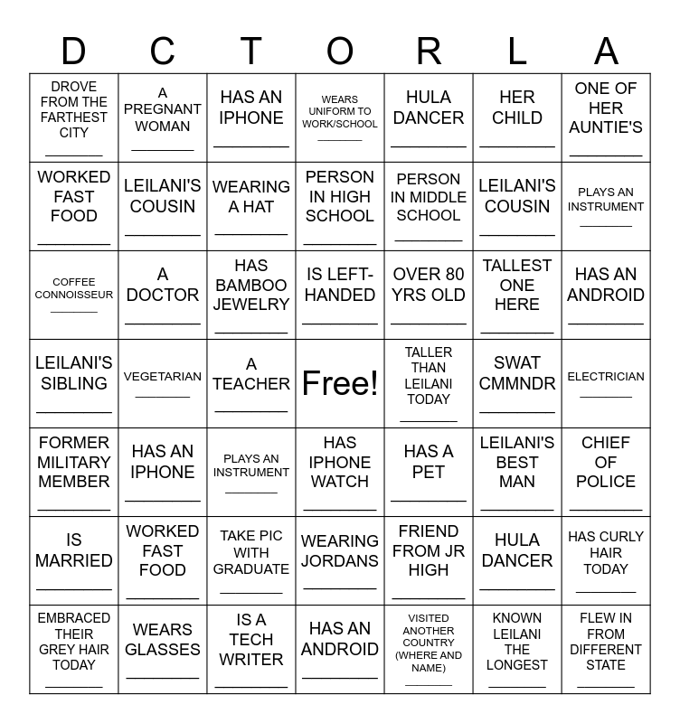 This bingo card has a free space and 58 words: HIGH SCHOOL FRIEND ________, LEILANI'S SIBLING ________, PRO-WRESTLER ________, A DOCTOR ________, A TEACHER ________, FRIEND FROM JR HIGH ________, ONE OF HER AUNTIE'S ________, DROVE FROM THE FARTHEST CITY ________, LEILANI'S COUSIN ________, HULA DANCER ________, WEARS UNIFORM TO WORK/SCHOOL ________, WORKED FAST FOOD ________, PLAYS AN INSTRUMENT ________, HAS AN IPHONE ________, HAS AN ANDROID ________, DROVE FROM THE FARTHEST CITY ________, LEILANI'S COUSIN ________, HULA DANCER ________, WEARS UNIFORM TO WORK/SCHOOL ________, WORKED FAST FOOD ________, PLAYS AN INSTRUMENT ________, HAS AN IPHONE ________, HAS AN ANDROID ________, TALLEST ONE HERE ________, FIREKNIFE DANCER ________, COFFEE CONNOISSEUR ________, ELECTRICIAN ________, RETIRED ________, WEARING A HAT ________, HAS A PET ________, WEARING A RING ________, IS MARRIED ________, IS A TECH WRITER ________, VISITED ANOTHER COUNTRY (WHERE AND NAME) ________, TALLER THAN LEILANI TODAY ________, HAS IPHONE WATCH ________, TAKE PIC WITH GRADUATE ________, PERSON IN MIDDLE SCHOOL ________, PERSON IN HIGH SCHOOL ________, WEARING JORDANS ________, HAS BAMBOO JEWELRY ________, FLEW IN FROM DIFFERENT STATE ________, OVER 80 YRS OLD ________, WEARING NIKE SHOES ________, HAS CURLY HAIR TODAY ________, EMBRACED THEIR GREY HAIR TODAY ________, WEARS GLASSES ________, IS LEFT-HANDED ________, VEGETARIAN ________, KNOWN LEILANI THE LONGEST ________, CHIEF OF POLICE ________, SWAT CMMNDR ________, FORMER MILITARY MEMBER ________, LEILANI'S BEST MAN ________, A PREGNANT WOMAN ________, ROCKET INSPECTOR ________, HER CHILD ________ and IS A DJ ________.