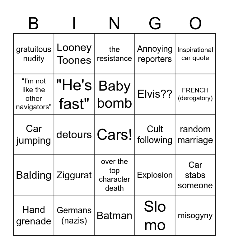 This bingo card has a free space and 24 words: Ziggurat, Germans (nazis), Baby bomb, Hand grenade, Inspirational car quote, gratuitous nudity, "I'm not like the other navigators", Looney Toones, Cult following, over the top character death, Elvis??, Car jumping, Explosion, Car stabs someone, "He's fast", Slo mo, random marriage, the resistance, FRENCH (derogatory), detours, misogyny, Balding, Annoying reporters and Batman.