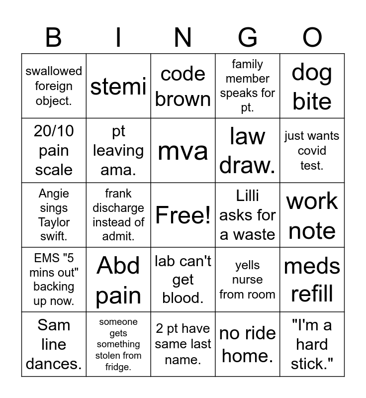 This bingo card has a free space and 24 words: Abd pain, someone gets something stolen from fridge., mva, Sam line dances., dog bite, swallowed foreign object., 20/10 pain scale, stemi, Lilli asks for a waste, lab can't get blood., law draw., Angie sings Taylor swift., yells nurse from room, meds refill, pt leaving ama., no ride home., work note, code brown, just wants covid test., frank discharge instead of admit., "I'm a hard stick.", EMS "5 mins out" backing up now., family member speaks for pt. and 2 pt have same last name..