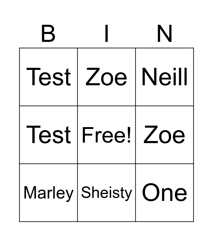 This bingo card has a free space and 14 words: Boomer, Lets Go, Marley, Zoe, Test, One, Two, Three, Sheisty, Test, Boomer, Zoe, Neill and Mega Boomer.