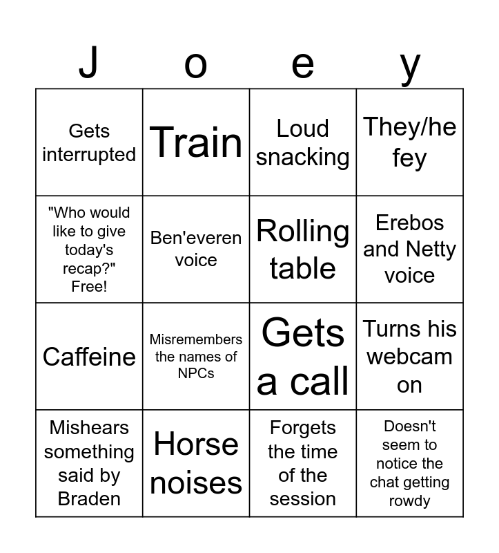 This bingo card has 16 words: Horse noises, Turns his webcam on, Loud snacking, Gets interrupted, Caffeine, Train, Gets a call, Forgets the time of the session, "Who would like to give today's recap?" Free!, Ben'everen voice, Mishears something said by Braden, They/he fey, Misremembers the names of NPCs, Erebos and Netty voice, Rolling table and Doesn't seem to notice the chat getting rowdy.