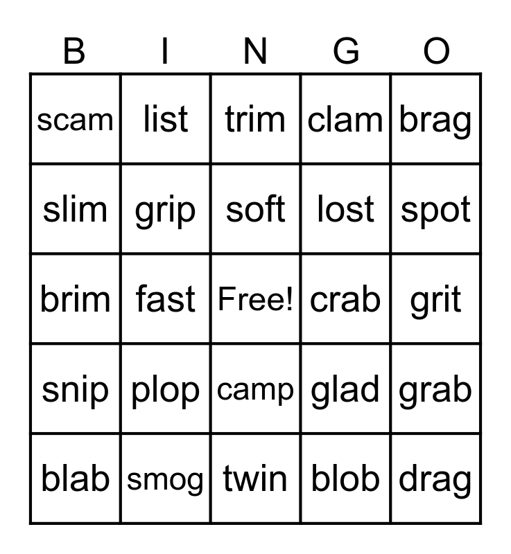 This bingo card has a free space and 29 words: blab, squid, fast, flag, scam, trim, grip, plop, crab, smog, grit, drag, twin, blob, spot, band, camp, snip, brag, brim, glad, last, lost, slim, clam, list, grab, soft and pond.