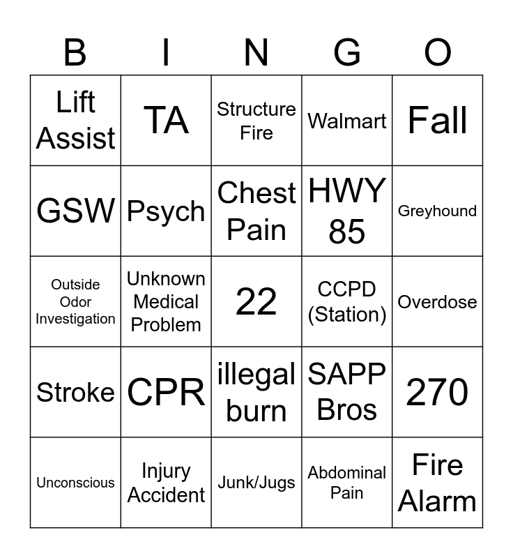 This bingo card has a free space and 24 words: Unconscious, CPR, Chest Pain, Abdominal Pain, Fall, Lift Assist, TA, Structure Fire, CCPD (Station), Overdose, Outside Odor Investigation, Psych, SAPP Bros, 270, GSW, Injury Accident, Junk/Jugs, Walmart, Greyhound, Stroke, Unknown Medical Problem, illegal burn, HWY 85 and Fire Alarm.