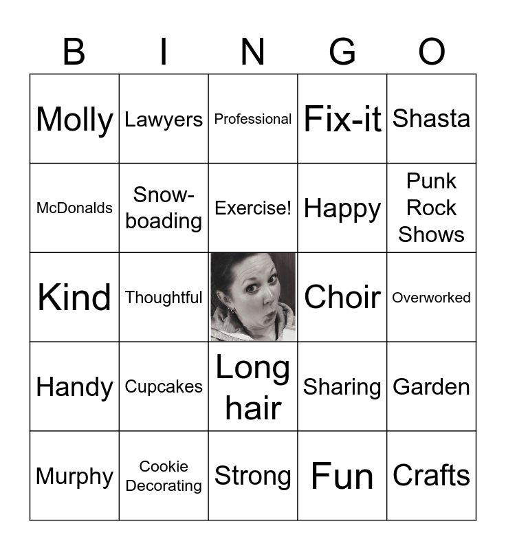 This bingo card has a free space and 24 words: Cupcakes, Cookie Decorating, Exercise!, Murphy, Shasta, Molly, McDonalds, Lawyers, Choir, Long hair, Happy, Kind, Sharing, Garden, Snow-boading, Fun, Overworked, Professional, Punk Rock Shows, Thoughtful, Crafts, Handy, Fix-it and Strong.