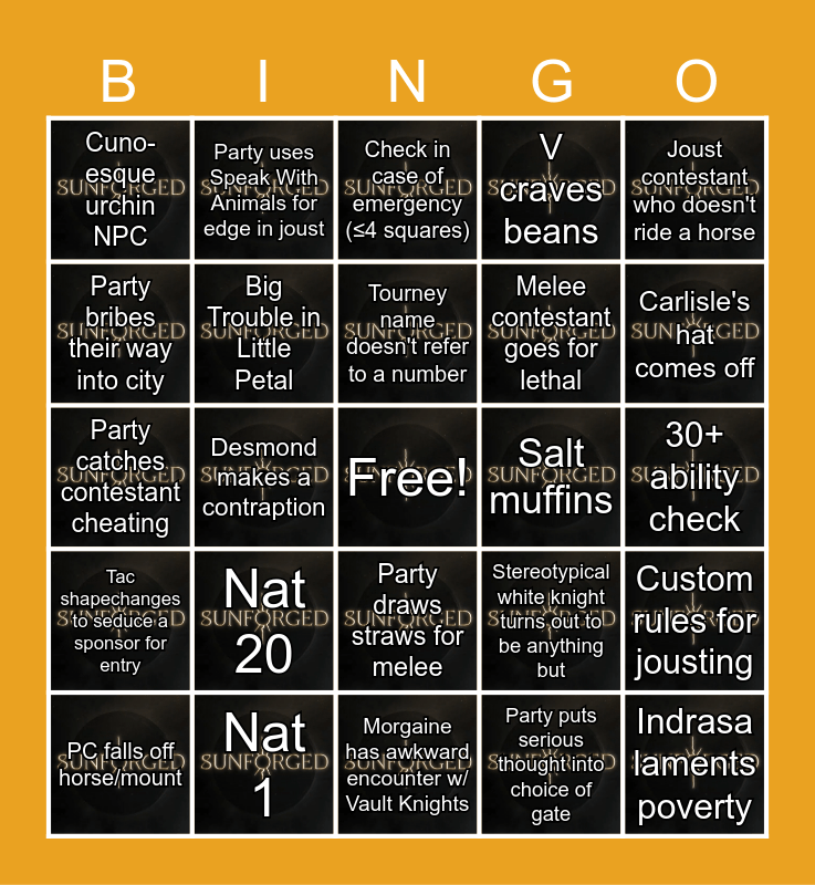 This bingo card has 24 images, a free space and 24 words: Nat 20, Nat 1, Tourney name doesn't refer to a number, PC falls off horse/mount, Joust contestant who doesn't ride a horse, Cuno-esque urchin NPC, Party bribes their way into city, Party uses Speak With Animals for edge in joust, Salt muffins, Party draws straws for melee, Melee contestant goes for lethal, Party catches contestant cheating, Stereotypical white knight turns out to be anything but, Custom rules for jousting, Big Trouble in Little Petal, Party puts serious thought into choice of gate, 30+ ability check, Check in case of emergency (≤4 squares), Carlisle's hat comes off, Desmond makes a contraption, Indrasa laments poverty, Tac shapechanges to seduce a sponsor for entry, V craves beans and Morgaine has awkward encounter w/ Vault Knights.