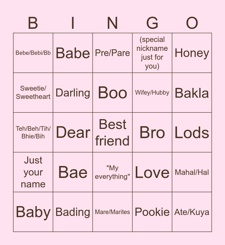 This bingo card has a free space and 24 words: Baby, Bae, Boo, Pookie, Honey, Bebe/Bebi/Bb, Babe, Pre/Pare, Bro, Lods, Teh/Beh/Tih/ Bhie/Bih, Darling, Love, Mahal/Hal, Sweetie/ Sweetheart, Bading, Mare/Marites, (special nickname just for you), Bakla, Just your name, Dear, "My everything", Wifey/Hubby and Ate/Kuya.