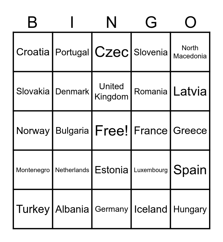 This bingo card has a free space and 30 words: Albania, Belgium, Bulgaria, Canada, Croatia, Czec, Denmark, Estonia, France, Germany, Greece, Hungary, Iceland, Italy, Latvia, Lithuania, Luxembourg, Montenegro, Netherlands, North Macedonia, Norway, Poland, Portugal, Romania, Slovakia, Slovenia, Spain, Turkey, United Kingdom and US.