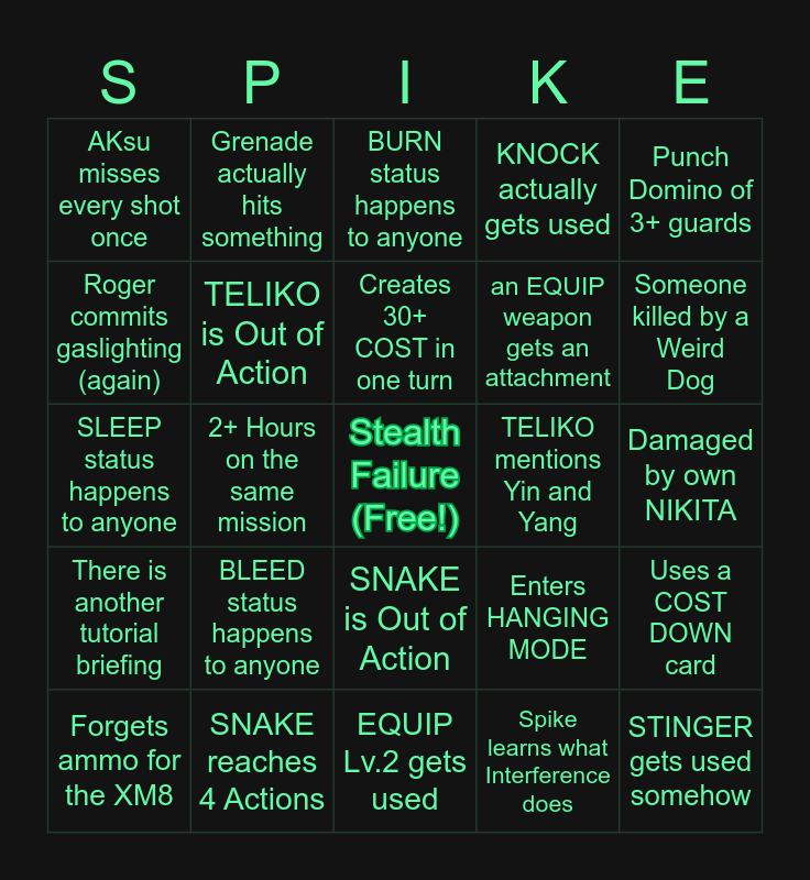 This bingo card has a free space and 24 words: BLEED status happens to anyone, SNAKE reaches 4 Actions, Creates 30+ COST in one turn, Forgets ammo for the XM8, Punch Domino of 3+ guards, AKsu misses every shot once, Roger commits gaslighting (again), Grenade actually hits something, TELIKO mentions Yin and Yang, SNAKE is Out of Action, an EQUIP weapon gets an attachment, SLEEP status happens to anyone, Enters HANGING MODE, Uses a COST DOWN card, TELIKO is Out of Action, Spike learns what Interference does, Damaged by own NIKITA, BURN status happens to anyone, Someone killed by a Weird Dog, 2+ Hours on the same mission, STINGER gets used somehow, There is another tutorial briefing, KNOCK actually gets used and EQUIP Lv.2 gets used.