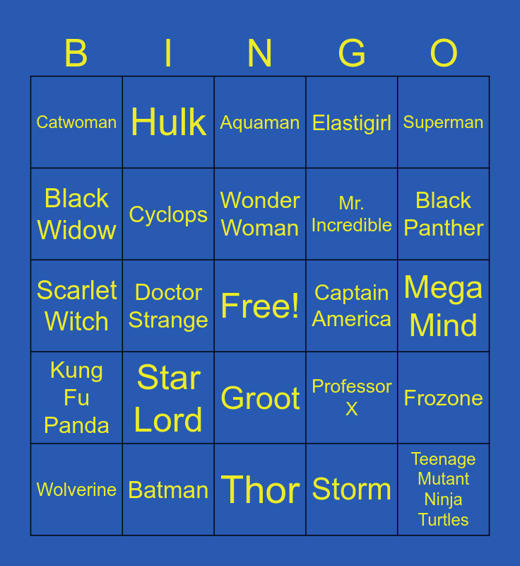 This bingo card has a free space and 24 words: Star Lord, Batman, Wonder Woman, Wolverine, Superman, Catwoman, Black Widow, Hulk, Captain America, Groot, Mr. Incredible, Scarlet Witch, Professor X, Frozone, Cyclops, Storm, Mega Mind, Aquaman, Black Panther, Doctor Strange, Teenage Mutant Ninja Turtles, Kung Fu Panda, Elastigirl and Thor.