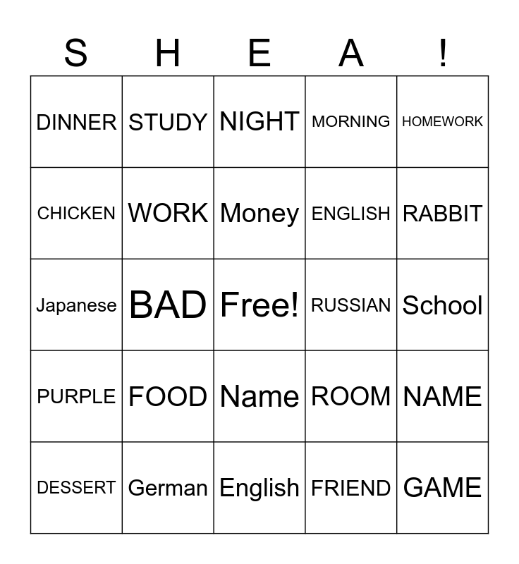 This bingo card has a free space and 90 words: Hello, Thank You, Name, Red, Purple, Dinner, Morning, Night, Good, Bad, Rabbit, Dessert, Chicken, School, Class, Money, Room, Paper, Key, Rice, House, Language, English, Korean, Japanese, German, Chinese, Russian, ASL, HELLO, THANK YOU, NAME, RED, PURPLE, DINNER, MORNING, NIGHT, GOOD, BAD, RABBIT, DESSERT, CHICKEN, SCHOOL, CLASS, MONEY, ROOM, PAPER, KEY, RICE, HOUSE, LANGUAGE, ENGLISH, KOREAN, JAPANESE, GERMAN, CHINESE, RUSSIAN, ASL, SPANISH, FRENCH, BAG, STUDENT, LEARN, TO HELP, HEART, SISTER, BROTHER, FRIEND, FAMILY, TO WALK, FOOD, GAME, TO MEET, ROOMMATE, STUDY, WORK, BOOK, DRIVE, DAY, TO LOVE, WALLET, HOMEWORK, TO SIGN, TO CRY, BREAD, FUN (adj), TO EAT, RAIN, APPLE and EARTH.