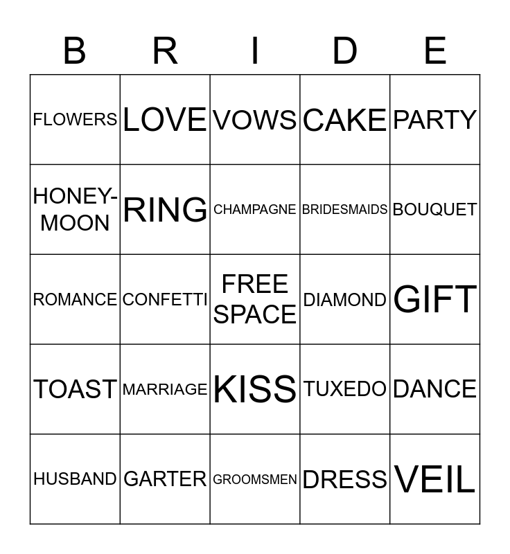 This bingo card has a free space and 24 words: MARRIAGE, GARTER, CHAMPAGNE, HUSBAND, PARTY, FLOWERS, HONEY-MOON, LOVE, DIAMOND, KISS, BRIDESMAIDS, ROMANCE, TUXEDO, DANCE, RING, DRESS, GIFT, VOWS, BOUQUET, CONFETTI, VEIL, TOAST, CAKE and GROOMSMEN.
