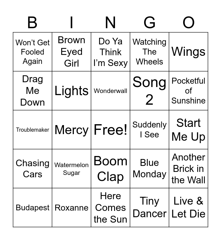 This bingo card has a free space and 25 words: Watermelon Sugar, Here Comes the Sun, Wonderwall, Budapest, Wings, Won’t Get Fooled Again, Drag Me Down, Brown Eyed Girl, Suddenly I See, Boom Clap, Song 2, Troublemaker, Blue Monday, Another Brick in the Wall, Lights, Spice up your Life, Start Me Up, Do Ya Think I’m Sexy, Pocketful of Sunshine, Mercy, Live & Let Die, Roxanne, Chasing Cars, Watching The Wheels and Tiny Dancer.