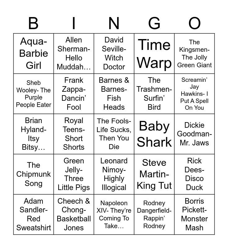 This bingo card has 27 words: Steve Martin- King Tut, Borris Pickett- Monster Mash, The Trashmen- Surfin’ Bird, Napoleon XIV- They’re Coming To Take…, Sheb Wooley- The Purple People Eater, David Seville- Witch Doctor, Allen Sherman- Hello Muddah…, The Chipmunk Song, Baby Shark, Rick Dees- Disco Duck, Brian Hyland- Itsy Bitsy…, Time Warp, Adam Sandler- Red Sweatshirt, Cheech & Chong- Basketball Jones, Screamin’ Jay Hawkins- I Put A Spell On You, Joe Dolce- Shaddup Your Face, Frank Zappa- Dancin’ Fool, Barnes & Barnes- Fish Heads, Green Jelly- Three Little Pigs, Aqua- Barbie Girl, Dickie Goodman- Mr. Jaws, Rodney Dangerfield- Rappin’ Rodney, Royal Teens- Short Shorts, The Fools- Life Sucks, Then You Die, Leonard Nimoy- Highly Illogical, The Kingsmen- The Jolly Green Giant and Tenacious D- Tribute.