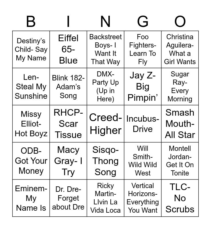 This bingo card has 29 words: Eminem- My Name Is, Santana- Smooth, RHCP- Scar Tissue, TLC- No Scrubs, Destiny’s Child- Say My Name, Backstreet Boys- I Want It That Way, Blink 182- Adam’s Song, Macy Gray- I Try, Incubus- Drive, Dr. Dre- Forget about Dre, Smash Mouth- All Star, Creed- Higher, Ricky Martin- LIvin La Vida Loca, Vertical Horizons- Everything You Want, Sugar Ray- Every Morning, Pearl Jam- Last Kiss, Sisqo- Thong Song, ODB- Got Your Money, Christina Aguilera- What a Girl Wants, Missy Elliot- Hot Boyz, Will Smith- Wild Wild West, Lou Bega- Mambo No. 5, Jay Z- Big Pimpin’, Len- Steal My Sunshine, Foo Fighters- Learn To Fly, Eiffel 65- Blue, Montell Jordan- Get It On Tonite, DMX- Party Up (Up in Here) and Dido- Thank You.